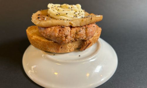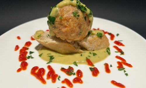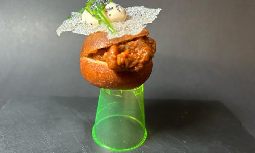 Pan de leche relleno de sobrasada de pescado realzado con un crujiente y salsa tártara de wakame.