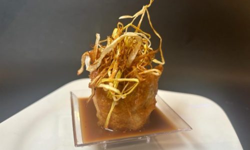 Rollito de ternera con verduras, toque de piment d’espelette y salsa especial.