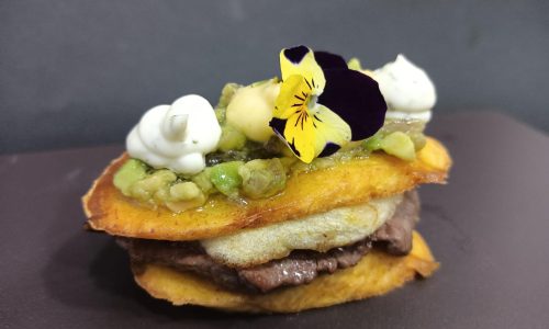 Solomillo sobre plátano macho, foie, pera a la brasa y aguacate con salsas de ochua y hierbabuena.