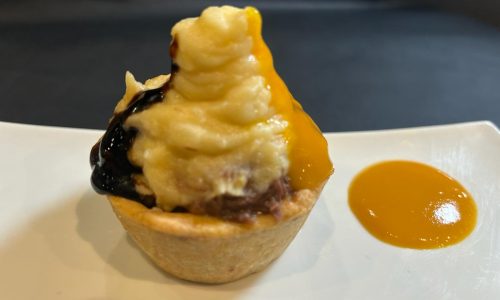 Tartaleta rellena de crema de carrillera y hongos con espuma de patata, pure de mango y salsa balsámica de Módena.