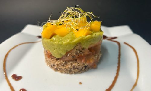 Montadito con base de pan multicereal, taquitos de tomate fresco macerado en lima limón y tres pimientas, guacamole y mango.