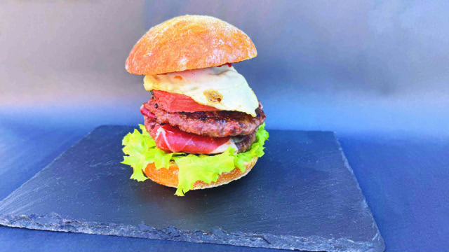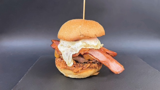 125 gramoko hanburgesa, benetako ogia, barbakoa saltsa, tipula karraskaria, cheddar gazta, hirugiharra eta arrautza.