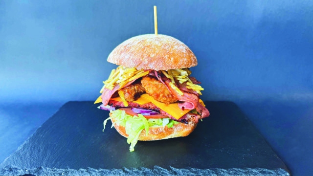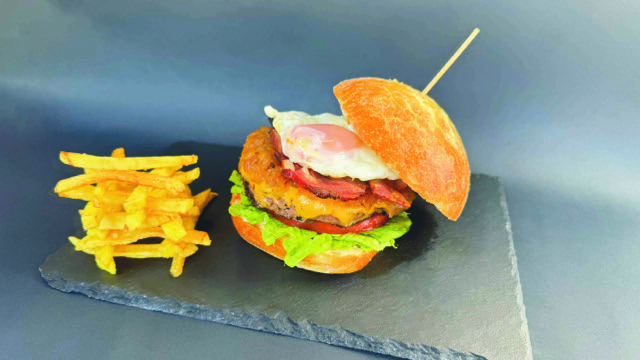 Kristalezko ogia, okela 0 km Lizaso, arrautza, letxuga, tomatea, tipula karamelizatua, cheddar gazta, hirugihar iberikoa, maionesa eta etxeko patata frijituak.