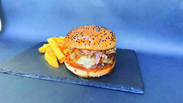Pan brioche, carne de vaca gallega, queso de oveja ahumado, panceta ahumada, pulled pork, crema cheddar, cebolla encurtida y sriracha.