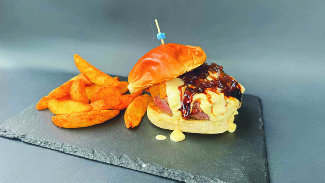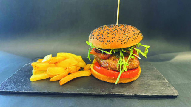 Txahal-hanburgesa, albaka-tximitxurria, cheddar gazta, kirten-chutneya, hirugiharra, errukula eta tomatea, etxeko patata frijituekin batera.
