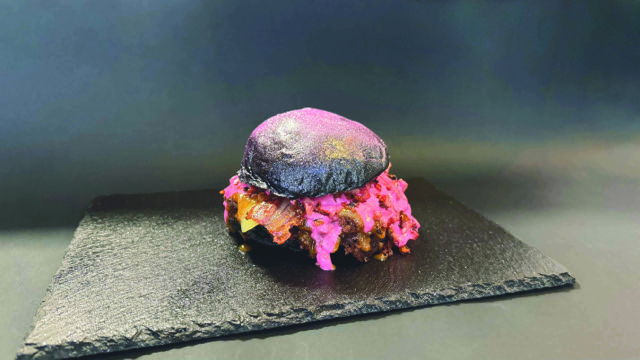 Pan brioche negro, dos carnes smash, queso Monterrey Jack, cheddar, bacón crispy, cebolla frita, panceta crujiente, salsa de queso rosa, salsa yakiniku de cacahuete y purpurina rosa de sakura.