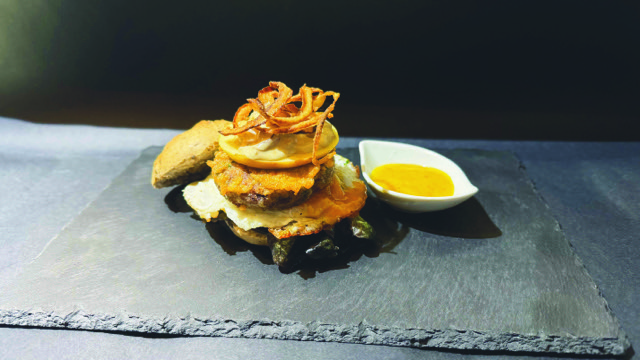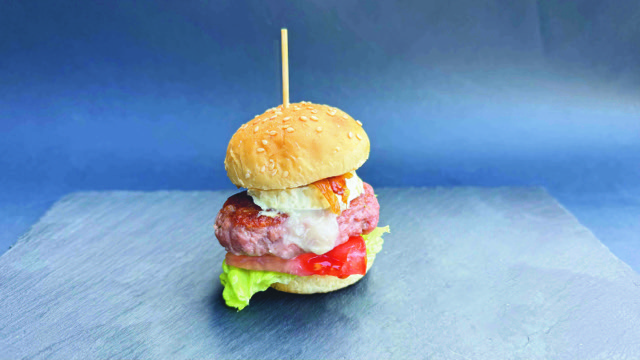 Mini hamburguesa de morcilla y ternera, manzana caramelizada, hoja de roble, tomate, cebolla, huevo de codorniz, pimientos asados, salsa de champis y queso azul, pan de aceitunas negras y mostaza de miel.