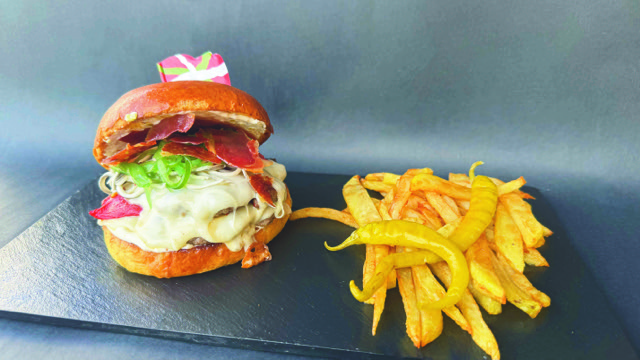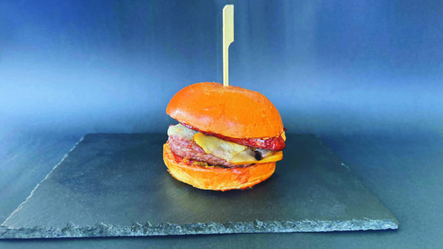 Hanburgesa 180 gramo txingarretan, Idiazabal gazta, txorizo errea, piper gorri eta berdeak, tipula erregosia eta pepinilloz egindako Propi saltsa.