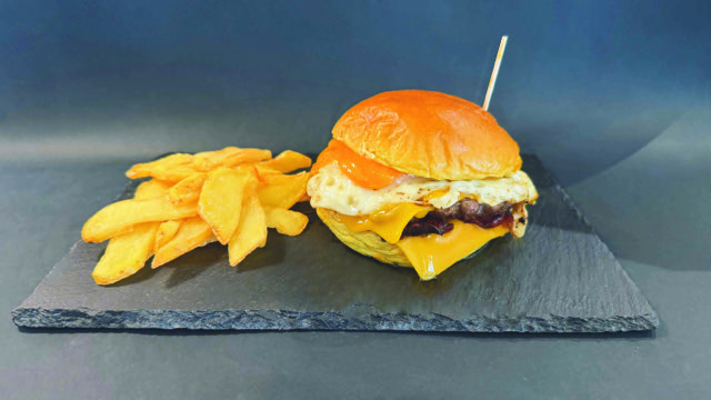 Pan brioche, carne de vacuno, canónigos, tomate, queso ahumado, virutas de bacón, chucrut de cebolla, salsa especial, huevo frito y patatas.