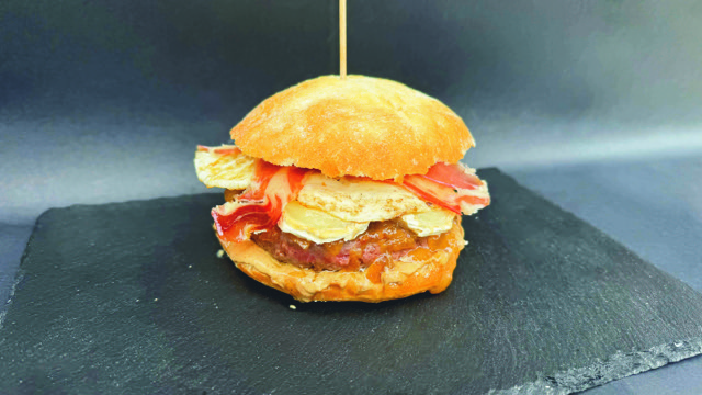Hanburgesa 180 gramo txingarretan, Idiazabal gazta, txorizo errea, piper gorri eta berdeak, tipula erregosia eta pepinilloz egindako Propi saltsa.
