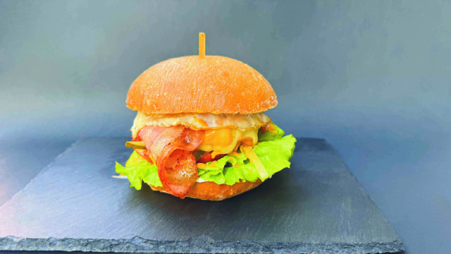 125 gramoko hanburgesa, benetako ogia, barbakoa saltsa, tipula karraskaria, cheddar gazta, hirugiharra eta arrautza.