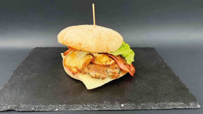 Pan rústico, carne moldeada en casa, queso Idiazabal, huevo caserío, loncha de jamón jabugo, bacón, lechuga, tomate, mayonesa y patatas caseras.