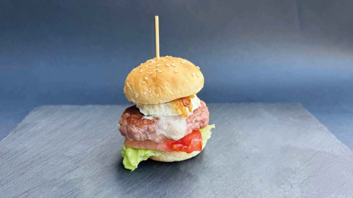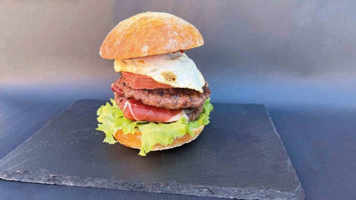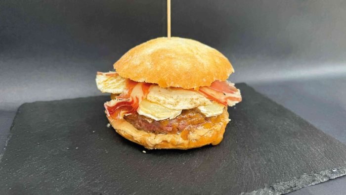 Pan tipo chapata, hamburguesa de ternera 180 gramos, queso de cabra, cebolla caramelizada, huevo a la plancha, jamón ibérico y salsa de boletus.
