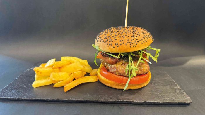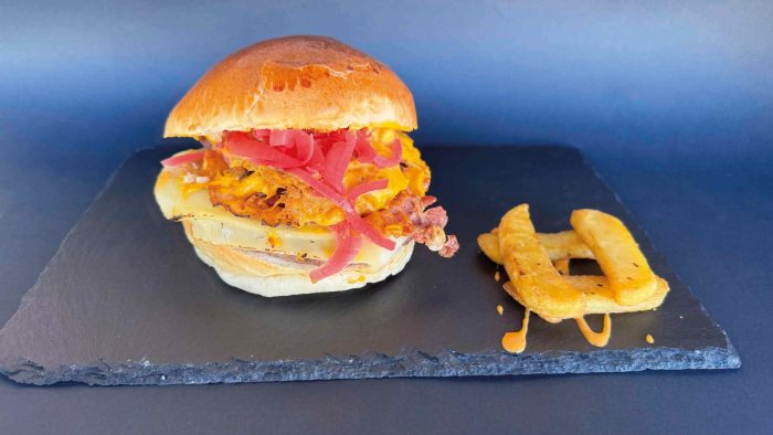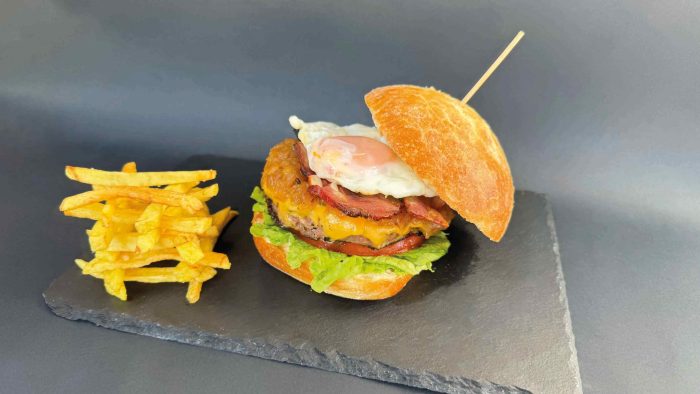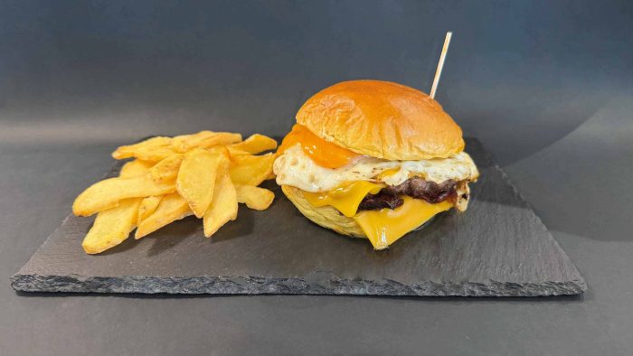Pan brioche, carne de vacuno, canónigos, tomate, queso ahumado, virutas de bacón, chucrut de cebolla, salsa especial, huevo frito y patatas.