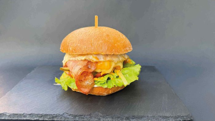 Hamburguesa de 125 gramos, pan de verdad, salsa barbacoa, cebolla crujiente, queso cheddar, bacón y huevo.