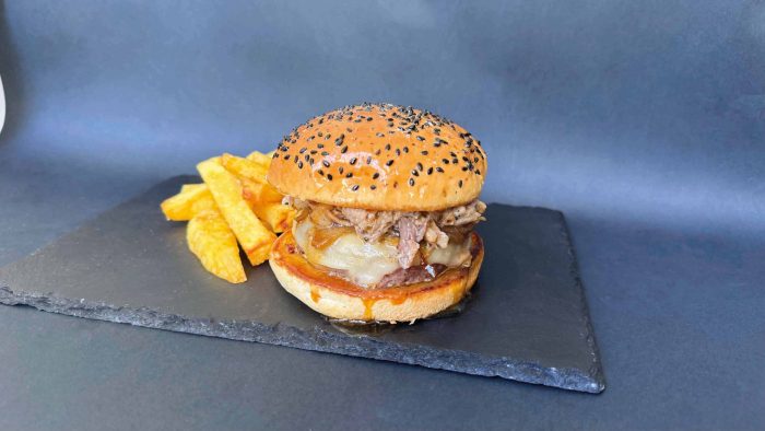 Pan brioche, 150 gramos de carne, 50 gramos de pulled pork, cebolla caramelizada, queso cheddar, pepinillos, salsa de huevo, mostaza, grana padano y barbacoa de Havana Origen, acompañada de patatas fritas.