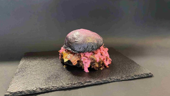 Pan brioche negro, dos carnes smash, queso Monterrey Jack, cheddar, bacón crispy, cebolla frita, panceta crujiente, salsa de queso rosa, salsa yakiniku de cacahuete y purpurina rosa de sakura.