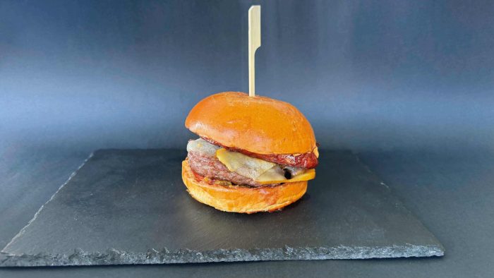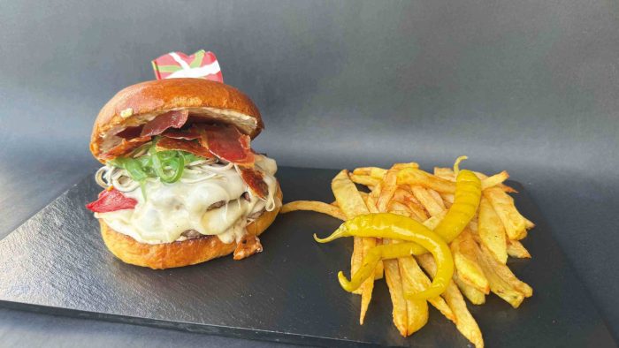 Hanburgesa 180 gramo txingarretan, Idiazabal gazta, txorizo errea, piper gorri eta berdeak, tipula erregosia, pepinilloz egindako Propi saltsa.