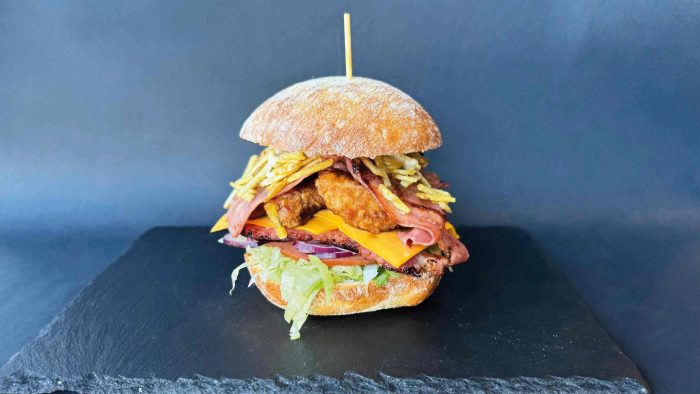 Pan de cristal, lechuga romana, cebolla morada, chuleta ahumada, pollo crocante a la BBQ, bacón, queso azul, salsa de la casa y patatas pajas.