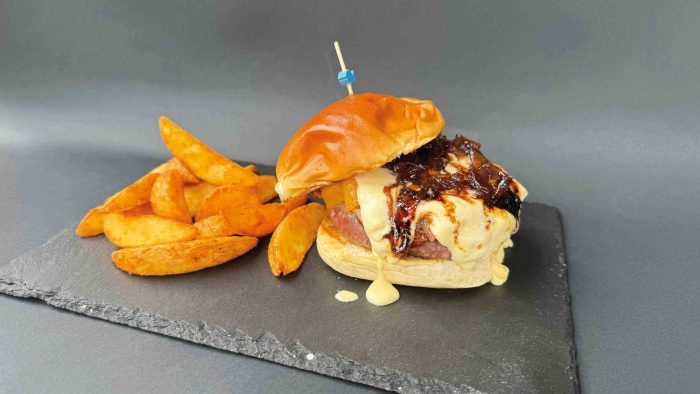 Pan brioche, carne 100 % vacuno 200 gramos, queso Edam, cuatro quesos en crema, cebolla caramelizada y patatas gajo.