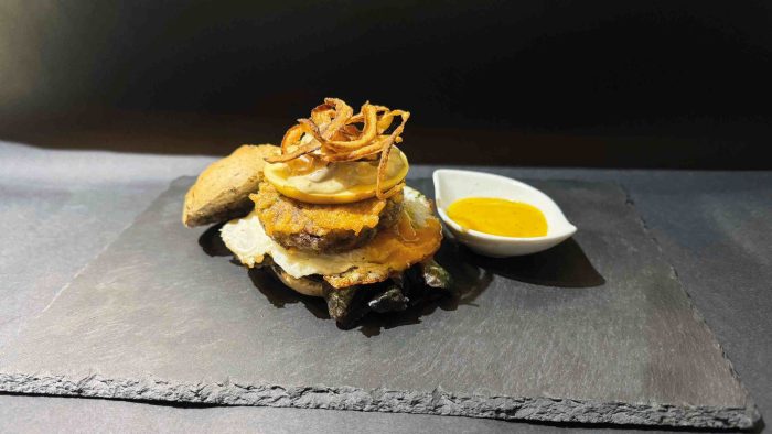 Mini hamburguesa de morcilla y ternera, manzana caramelizada, hoja de roble, tomate, cebolla, huevo de codorniz, pimientos asados, salsa de champis y queso azul, pan de aceitunas negras y mostaza de miel.