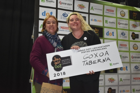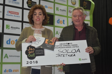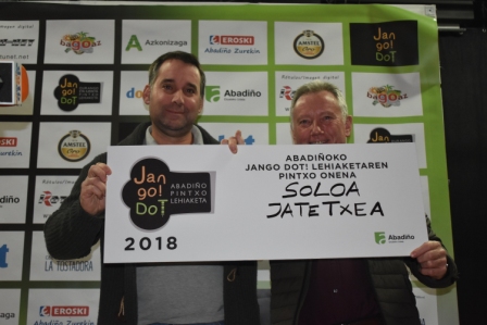 ABADIÑO.- El restaurante Soloa de Abadiño ha conseguido el premio al mejor pintxo de Jango Dot Abadiño 2018. La «Banderilla Teriyaki», la brocheta de queso con carpaccio de carne y salsa Teriyaki ha sido el pintxo elegido tanto por el jurado profesional como del popular, con 65 puntos y 51 votos respectivamente. Según el jurado profesional Goxoa, con el Brownie de Morcilla ha quedado en segundo lugar y Larrano Taberna con Larrano ha quedado en tercer lugar.