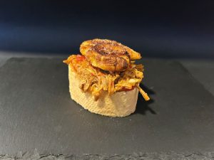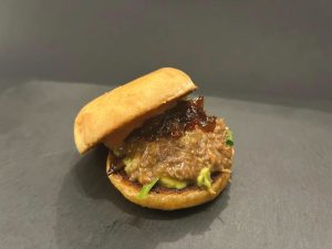 Hamburguesa de carrillera con guacamole, yuzu y mermelada de bacón.