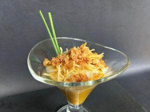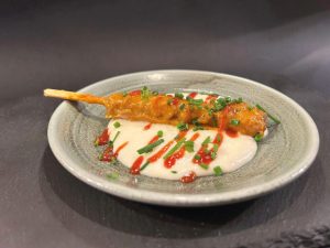Brocheta de pollo, salsa yakitori, puré de patata cítrico, albahaca y sésamo.