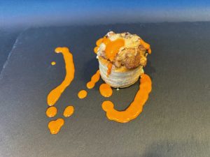 Volován relleno de pollo con boletus gratinado y salsa de pimiento rojo